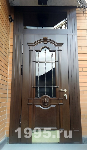 Двустворчатая дверь МДФ с карнизом, с остеклением и коваными решетками