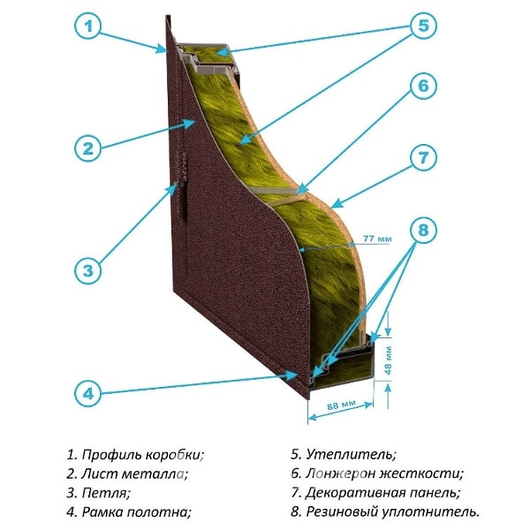 Короб двери изготовлен из профиля, а створка сделана из листа стали толщиной 2 мм.
