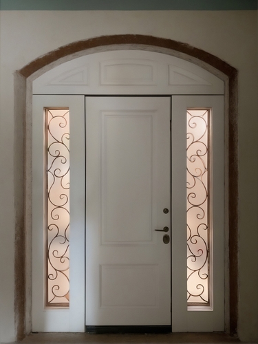 Двустворчатая дверь МДФ с карнизом, с остеклением и коваными решетками
