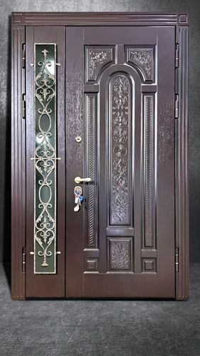 Полуторная термодверь с ажурной фрезеровкой, ковкой и стеклом