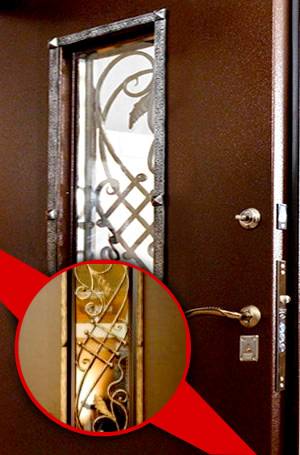 Декоративным функциям стальных дверей уделяется не меньшее значение, чем защитным и эксплуатационным. Для внутренней и внешней отделки часто используют такие материалы, как МДФ и панели из натурального дерева. Применяются различные элементы декора: витражи, стеклопакеты с узором, ковка.